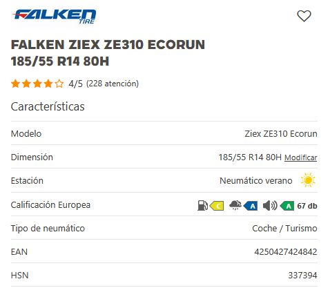 Añadir comparar Añadir deseos Neumaticos FALKEN Falken Ziex ZE310 Ecorun 185/55 R14 80H 0 Comentario(s)  Añadir comparar Añadir deseos 83,39 € Añadir al Carrito