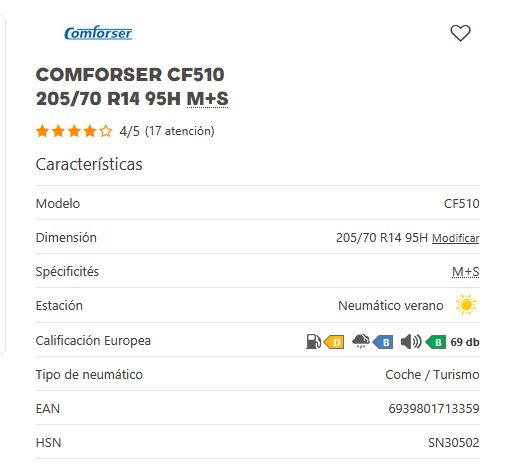 Añadir comparar Añadir deseos Neumaticos CONFORSER Comforser CF510 205/70 R14 95H M+S 0 Comentario(s)  Añadir comparar Añadir deseos 45,09 € Añadir al Carrito